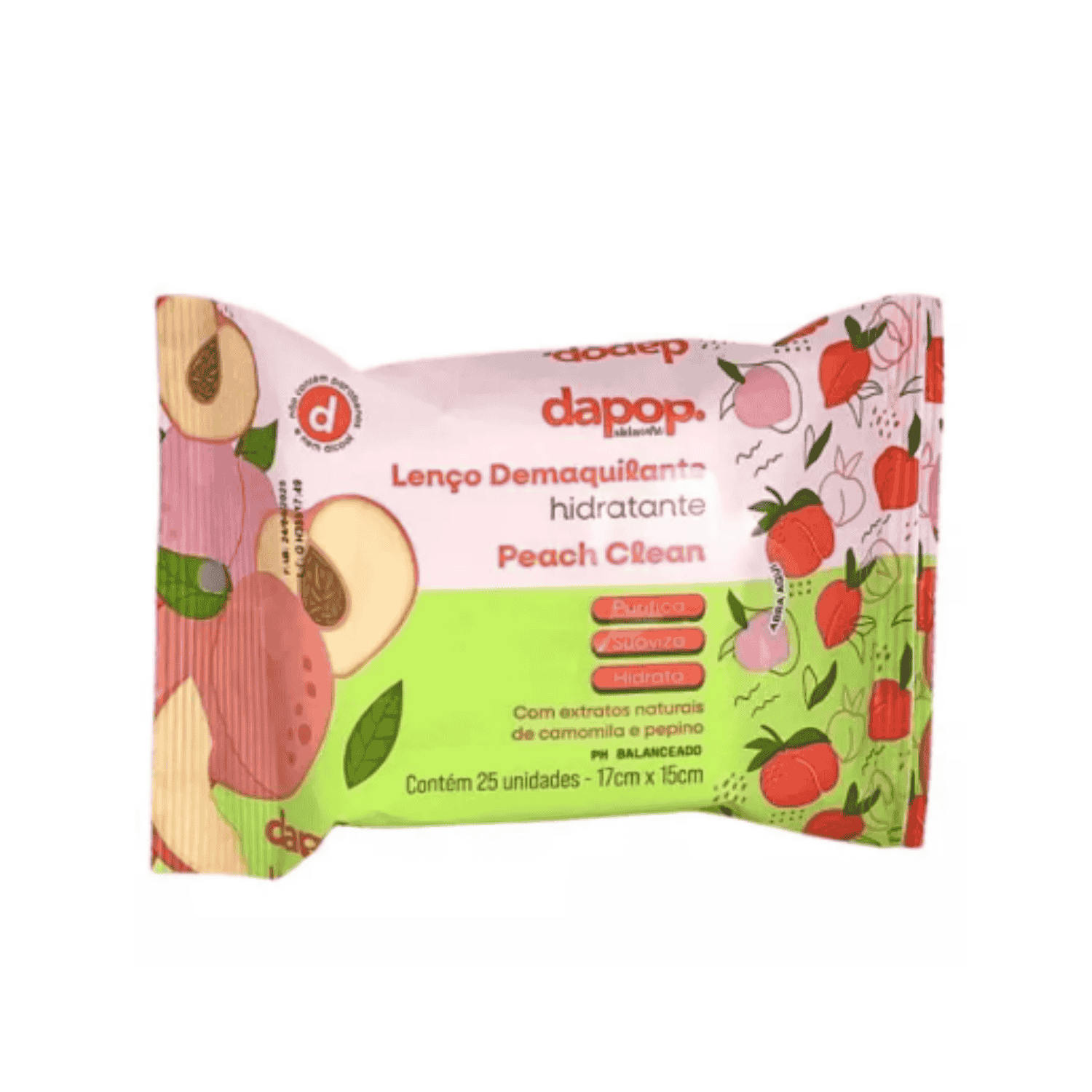 Lenço Demaquilante Hidratante Peach Clean Dapop — pele limpa, hidratada e perfumada com praticidade todos os dias!
